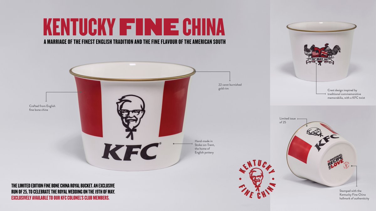 Στους γάμους είθισται να χαρίζουμε πορσελάνη! Το επετειακό limited edition KFC bucket που κατασκευάστηκε για τον γάμο του πρίγκηπα Χάρι με την Μέγκαν Μαρκλ “παντρεύει την βρετανική παράδοση με την γεύση του αμερικάνικου νότου”. Γεμίζεις chicken wings και παρακολουθείς τον γάμο σε επανάληψη!